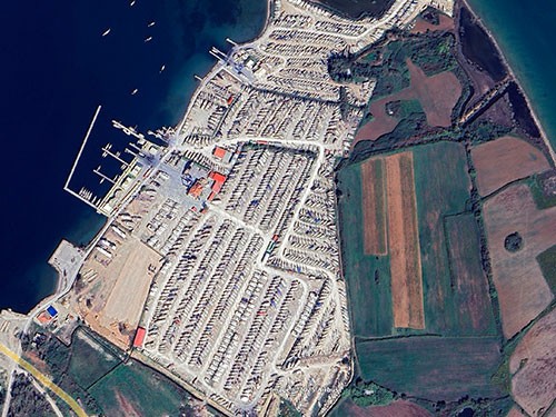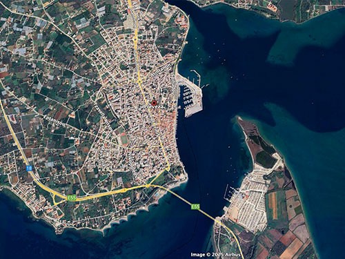 Preveza (links) und das enorme Schiffslager (rechts), verbunden mit einem Tunnel unter dem Kanal (Google Earth Fotos)