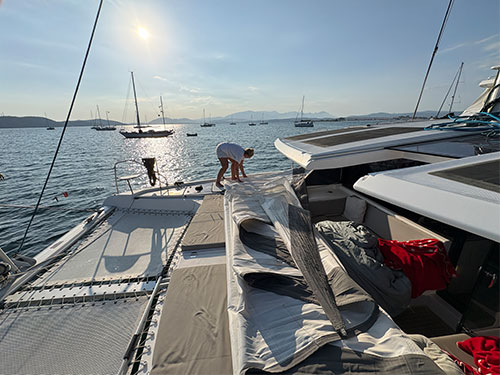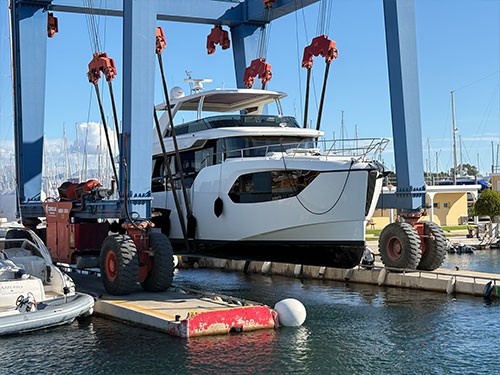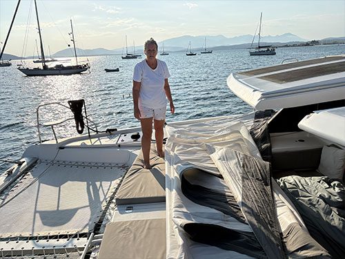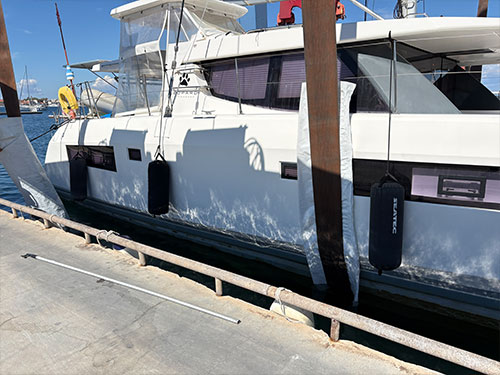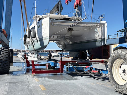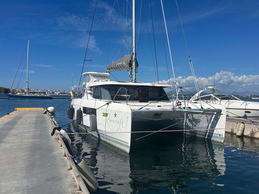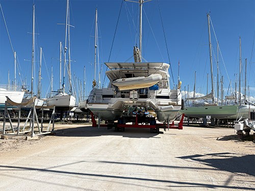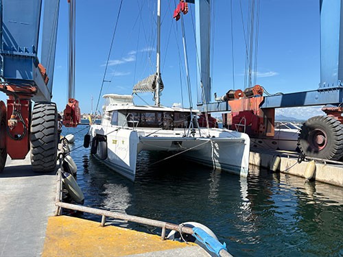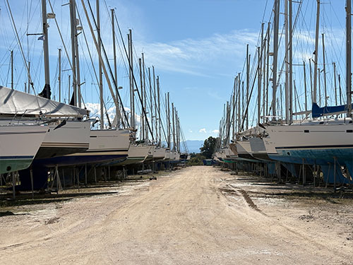 Für diese Winterpause entschieden wir, Rivercafe für längere Zeit an Land zu stellen, zum ersten Mal in ihrem fünfjährigen Leben. Nach zwei Jahren ohne Pause im Wasser, muss das Unterwasserschiff erneuert werden und die übliche Wartung der Propeller, Saildrives und Ventile sind an Land einfacher. Wir hatten schon zu Beginn der Saison einen Landplatz gebucht und einen Krantermin vereinbart. Für Eigner von Katamaranen empfehlenswert, denn die Anzahl von Werften mit professionellem Kran und Platz ist deutlich geringer als für Monohulls. Es ist kaum zu glauben, mit welchen Krankonstruktionen manche Werften Katamarane aus dem Wasser quälen und quetschen. Nicht so in Preveza.