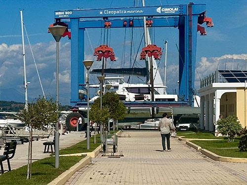 Das Auskranen in der Cleopatra Marina ist beeindruckend. Jetzt zum Ende der Saison, wird alle 15-20 Minuten ein Schiff, mit einem vom zwei Travel Liften aus dem Wasser gehoben. Die Jungs und das Equipment sind die besten, die ich jemals bei einer solchen Aktion sah. Alle Skipper bekommen eine Uhrzeit, zu der sie an der Kranstelle auftauchen und schließlich einlaufen sollen. Die Kran Crew legt unter Wasser die Schlingen um die richtigen Stellen der Rümpfe und hebt die Tonnenlast langsam aus dem Wasser, um sie dann auf einem bereitstehenden Tieflader abzusetzen. Der Rest ist Routine und Erfahrung, bis das Schiff fest und sicher an einem Platz an Land steht.