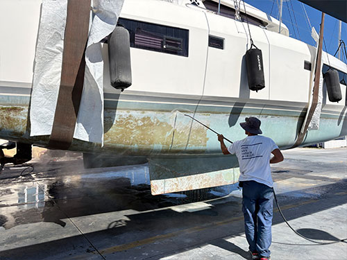 Als wir zum Kran gerufen wurden, erwischten wir ein sonniges und fast windstilles Fenster. Ein kleines Geschenk zum Ausklang. Nachdem unser Kranmeister die Rivercafe an Land gehoben hatte, wurde der Unterboden umgehend gedampfstrahlt (ein seltsames Wort). Unser Unterboden sah nach zwei Jahren und einer leichten Wäsche so sauber als, als ob wir gleich wieder zurück ins Wasser gekrant werden könnten. Die Unterschiede der vielen Antifouling Produkte sind bemerkenswert, die richtige Wahl erspart viel Zeit und Geld.