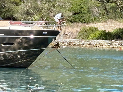 After three days, we had had enough of the stress of protecting Rivercafe from moorers and set off. A visit to Antipaxos was out of the question. It was far too crowded to find a safe place in one of the two anchorages. When you see ships anchoring with fenders, it’s better to turn around immediately.