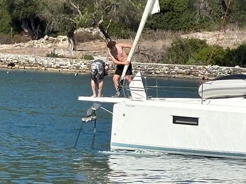 You see a lot of Paxos in the series, and it really is that beautiful. Paxos is cashing in on this popularity. Normally in Greece, the community docks are very cheap, but in Gaios we paid €60 (cash only) per night. A monohull of our size paid €40, without water, electricity or mooring lines. Our Rivercafe was in need of a good desalination washdown again, but there was no fresh water. The island suffers from a dramatic water shortage and even households often have sometimes no water, as we later learned. However, that didn’t stop the saleswoman from selling us a data card for non-existent fresh water.