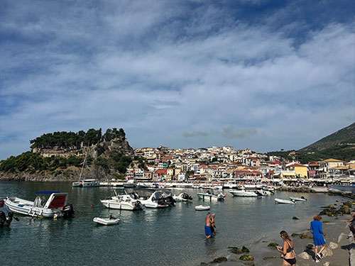 Refreshed by a dose of Paxos, we headed for Parga on the mainland instead of Antipaxos, on the recommendation of our friend Lorenz. (Dear Lorenz: now we have two topics on which we strongly disagree). As we approached, we encountered easily 30 vessels coming out of the bay, so we found a good anchorage at 7 m in sandy ground. Anchoring in the village itself is punishable by a fine (€500), so the anchorage is a little further north. Parga is a hardcore tourist resort, with hundreds of beach loungers, plenty of knick-knack shops and an unsightly amount of water sports for tourists: parasailing, water skiing, towable tubes and everything else that is loud and useless.